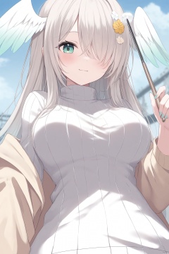 yishijie \(qingxu\),1girl, solo, long hair, breasts, looking at viewer, blush, smile, bangs, large breasts, hair ornament, long sleeves, holding, closed mouth, green eyes, blue hair, upper body, white hair, sky, day, cloud, virtual youtuber, nail polish, hair over one eye, blurry, sweater, sleeves past wrists, :3, blurry background, turtleneck, head wings, blue nails, one eye covered, turtleneck sweater, white sweater,