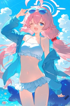 hoshino_\(swimsuit\)_\(blue_archive\), 1girl, eyewear_on_head, inflatable_toy, solo, one_eye_closed, halo, hoshino_\(blue_archive\), swimsuit, blue_eyes, pink_hair, white_bikini, smile, ahoge, bikini, blue_jacket, hair_ornament, outdoors, looking_at_viewer, open_mouth, long_hair, sky, jacket, cloud, sunglasses, frilled_bikini, frills, rainbow, blue_sky, twintails, blush, hair_bobbles, official_alternate_costume