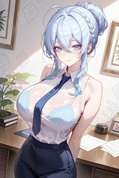 best quality,amazing quality,very aesthetic,absurdres,best quality,amazing quality,very aesthetic,absurdres,{{{{shiny skin}}}},{{{{oiled}}}},detail eyes,wallpaper,artist:aibek,artist:gwan-e,artist:kein_v,artist:liaowen,artist:sea_nami,artist:tansuan_(ensj3875),artist:ask_(askzy),artist:ciloranko,year 2023 BREAKcurvy,(narrow waist:1.1),<lora:Mifuyu Yukino:0.8>, -Mifuyu Yukino, 1girl, solo, breasts, blue eyes, shirt, necktie, smile, large breasts, looking at viewer, sleeveless, bare shoulders, sleeveless shirt, white shirt, hair bun, blue hair, skirt, ahoge, hair between eyes, indoors, single hair bun, braid, collared shirt, shirt tucked in, arms behind back, closed mouth, bangs, pants, blue necktie, office lady, bra visible through clothes, sidelocks
