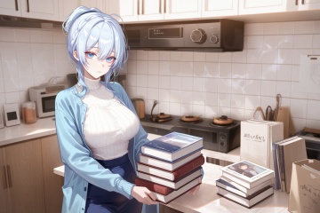 best quality,amazing quality,very aesthetic,absurdres,best quality,amazing quality,very aesthetic,absurdres,{{{{shiny skin}}}},{{{{oiled}}}},detail eyes,wallpaper,artist:aibek,artist:gwan-e,artist:kein_v,artist:liaowen,artist:sea_nami,artist:tansuan_(ensj3875),artist:ask_(askzy),artist:ciloranko,year 2023 BREAKcurvy,(narrow waist:1.1),<lora:Mifuyu Yukino:0.8>, -Mifuyu Yukino, 1girl, solo, sweater, holding, blue hair, skirt, jacket, blue eyes, book, blurry background, looking at viewer, blurry, blue jacket, white sweater, book stack, breasts, indoors, bangs, open clothes, holding book, turtleneck, medium hair, long sleeves, turtleneck sweater