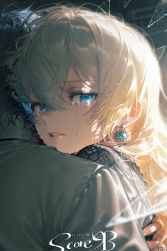 blue eyes, hug, jewelry, looking at viewer, black hair, 1girl, earrings, blurry, crying, tears, 1boy, parted lips, shards, glass, white hair, crying with eyes open, bangs, short hair, depth of field, long hair, looking back, upper body, dress, 2girls, copyright name, multiple girls, gem, long sleeves, blonde hair, broken glass, hair between eyes, artist name, blue hair, blood, lips, makeup,upper body,masterpiece,very aesthetic,absurdres
