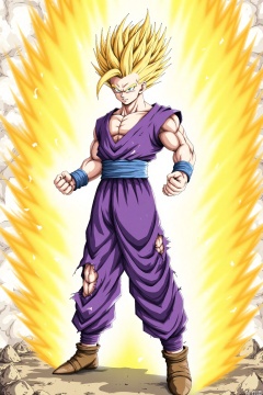 The image depicts a character standing confidently in the center, surrounded by a bright, fiery explosion. The character is wearing a purple martial arts uniform with a blue belt, and their hair is styled in a spiky manner. The background consists of a radiant yellow and white burst of energy, suggesting a powerful attack or transformation. The ground appears to be rocky and uneven, with some debris scattered around. The character's stance is strong and assertive, with fists clenched and eyes focused forward.