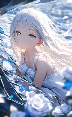 masterpiece,best quality,high quality,loli,Light Blue Theme,//,1girl,solo,long hair,dress,looking at viewer,white eyes,glass,grey eyes,white dress,white hair,flower,broken glass,white theme,bare shoulders,blue theme,dress flower,glass shards,white flower,water,parted lips,closed mouth,sleeveless,reflection,sleeveless dress,watermark,white rose,expressionless,//,year_2023,year_2024,//,official art,depth of field,detailed light,blurry background,cinematic lighting,ray tracing,amazing quality,very aesthetic,absurdres,beast quality,ultra detailed,god rays,backlighting,photo background,film grain,chromatic aberration,volumetric lighting,depth of field,blurry background,shiny skin,floating hair,cinematic lighting,day,very aesthetic,
