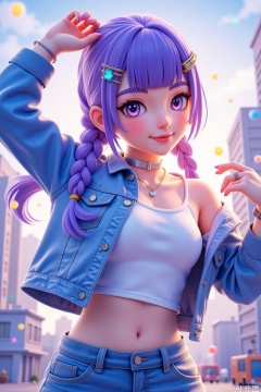 1girl, solo, long hair, looking at viewer, bangs, hair ornament, jewelry, purple eyes, braid, twintails,multicolored hair, choker, hairclip, pink eyes, off shoulder, star \(symbol\), nail polish, bracelet, aqua hair, ring, hair rings, star hair ornament, breasts, smile, open mouth, shirt, jacket, closed eyes, outdoors, open clothes, midriff, pants, armpits, arms up, crop top, tanks tops, denim, blue jacket, jeans, stretching, photo background ,backlighting,blue and white theme,depth of field,cinematic lighting,light particles,lens flare, (artist:quasarcake:0.8),extreme aesthetic,(wlop:0.6),masterpiece,best quality,good quality,newest,year 2024,year 2023,very aesthetic,absurdres,Visual impact,A shot with tension, ultra-high resolution,32K UHD,sharp focus,best-quality,masterpiece,Emotionalization,unconventional supreme masterpiece,masterful details,temperate atmosphere,with a high-end texture,in the style of fashion photography, (Visual impact:1.2),giving the poster a dynamic and visually striking appearance,impactful picture,offcial art,colorful,splash of color,movie perspective, masterpiece,best quality,amazing quality,very aesthetic,absurdres,best quality,newest