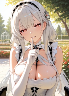 <lora:scylla_IL_v1.0:1>,scylla \(azur lane\),low twintails,frilled dress,hair ornament,elbow gloves,painterly,impasto,starlab,cross-shaped pupils,smile,parted lips,half-closed eyes,head tilt,finger to mouth,(shushing:0.7),low wings,upper body,sidelighting,garden, masterpiece,best quality,