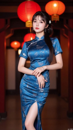 The image is a portrait of a young woman wearing a traditional Chinese dress. The dress is blue with a floral pattern and has a high neckline and short sleeves. The woman is standing in front of a background of red lanterns hanging from the ceiling, creating a festive atmosphere. She has long dark hair styled in a bun with a flower crown on top. She is posing with one hand on her hip and the other resting on her thigh. The overall mood of the image is elegant and traditional.