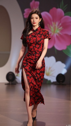 The image shows a young woman walking on a stage. She is wearing a red and black floral dress with short sleeves and a high slit on the side. The dress has a high neckline and short sleeves, and she is wearing black high heels. The woman has long dark hair styled in a sleek updo and is wearing minimal makeup. The background of the stage is decorated with large pink and green flowers and a large number 4. The overall mood of the image is elegant and sophisticated.