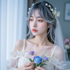 quyou \(wutong\),The image depicts a young woman with a serene and ethereal appearance. She has light gray hair styled in soft waves,adorned with delicate white floral accessories that give her a bridal look. Her makeup is subtle,with a focus on her natural features,including a soft pink lip color. She is dressed in a white lace garment that has off-shoulder sleeves,adding to the romantic and vintage aesthetic. In her hands,she holds a small bouquet of flowers,including a prominent blue rose and a few smaller pink and purple blooms. The flowers are arranged in a way that complements her attire and adds to the overall dreamy atmosphere of the image. The background is softly blurred,with a light blue hue that complements the colors in her attire and the flowers she is holding. The lighting is gentle and diffused,creating a gentle and peaceful ambiance.
