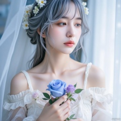 quyou \(wutong\),The image depicts a young woman with a serene and ethereal appearance. She has light gray hair styled in soft waves,adorned with delicate white floral accessories that give her a bridal look. Her makeup is subtle,with a focus on her natural features,including a soft pink lip color. She is dressed in a white lace garment that has off-shoulder sleeves,adding to the romantic and vintage aesthetic. In her hands,she holds a small bouquet of flowers,including a prominent blue rose and a few smaller pink and purple blooms. The flowers are arranged in a way that complements her attire and adds to the overall dreamy atmosphere of the image. The background is softly blurred,with a light blue hue that complements the colors in her attire and the flowers she is holding. The lighting is gentle and diffused,creating a gentle and peaceful ambiance.