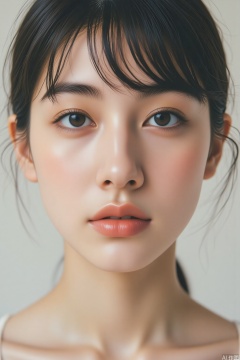 1girl, solo, looking at viewer, short hair, bangs, black hair, dress, bare shoulders, collarbone, upper body, parted lips, black eyes, lips, realistic