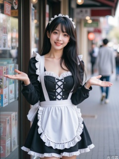 quyou \(wutong\),A young Asian girl dressed as a black maid stands gracefully at the entrance of an anime store. She wears a white maid apron that contrasts sharply with her dark outfit. Her anime-style hair is adorned with a delicate hair ornament, adding a touch of elegance. Her miniskirt reveals her smooth thighs, and her posture subtly emphasizes her cleavage and large breasts, giving a sense of youthful innocence. She smiles warmly, inviting customers into the store. The scene is captured with a wide-angle lens to show the bustling street behind her, with a shallow depth of field (f/2.8) to keep her in sharp focus while blurring the background. The composition is centered, highlighting her welcoming gesture.