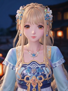 <lora:test1:0.7>,chinese clothes,1girl,jewelry,solo,blonde hair,long hair,hair ornament,necklace,dress,brown eyes,flower,long sleeves,hanfu,upper body,looking at viewer,hair flower,dark background,earrings,simple background,braid,cuteg,medium eyes,china architecture,lantern festival, china lantern