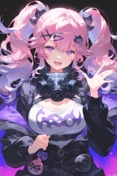 1girl, solo, hair_ornament, mask, long_hair, smile, twintails, pink_hair, fangs, gas_mask, looking_at_viewer, jacket, hairclip, black_jacket, open_mouth, purple_eyes, long_sleeves, hand_up, :d, shirt, upper_body, breasts, open_clothes