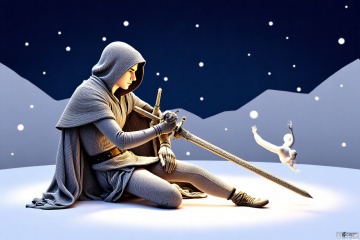 solo, 1boy, holding, sitting, weapon, male focus, sword, hood, cape, holding weapon, armor, glowing, holding sword, gauntlets, cloak, snow, 1other, hood up, snowing, one knee, planted, full armor, planted sword, ambiguous gender