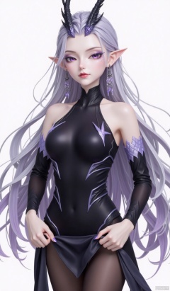 1girl,Long hair,,powder eye shadow,Dragon horn,purple pupils,Earrings,fish scale,Pointed ears,looking at viewer,pantyhose pull,Black silk jumpsuit