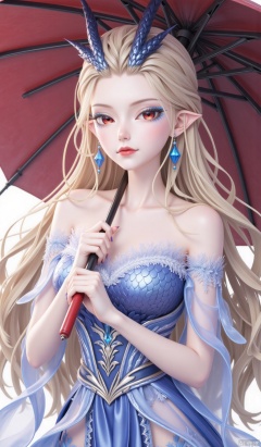 1girl,Long hair,,powder eye shadow,Dragon horn,Blue eyesBlue eye shadow,Earrings,fish scale,Pointed ears,looking at viewer,1girl, solo, long hair, breasts, looking at viewer, blonde hair, red eyes, dress, holding, bare shoulders, jewelry, upper body, earrings, makeup, umbrella, holding umbrella, red lips
