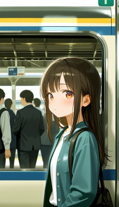 1girl,train train station,crowd,depth of field,upper body,best quality,detail eyes,film,, best quality,amazing quality,very aesthetic,absurdres,masterpiece,