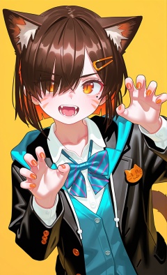 masterpiece,best quality,1girl,solo,animal ears,bow,teeth,jacket,tail,open mouth,brown hair,orange background,bowtie,orange nails,simple background,cat ears,orange eyes,blue bow,animal ear fluff,cat tail,looking at viewer,upper body,shirt,school uniform,hood,striped bow,striped,white shirt,black jacket,blue bowtie,fingernails,long sleeves,cat girl,bangs,fangs,collared shirt,striped bowtie,short hair,tongue,hoodie,sharp teeth,facial mark,claw pose,hooded jacket,blue hoodie,yellow background,hair ornament,paw ornament,tail raised,dress shirt,hairpin,slit pupils,hair over one eye,arm behind back,striped clothes,whisker markings,hand up,, masterpiece,best quality,amazing quality,very aesthetic,absurdres,newest,scenery,masterpiece, best quality, amazing quality, very aesthetic, absurdres, newest,, (reoen:2),(adpx:1.5),(shexyo),(asakuraf:1.5),(tianliangduohefangdongye:1),(m k:1.2),