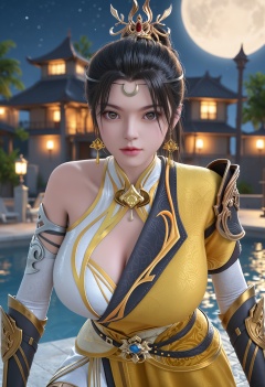 (score_9:1.1),(perfect_anatomy:1.1),upper_body,blurry background,depth of field,(IMG_2019.HEIC),(IMG_2018.CR2),(album_dcim.cr2),(looking_at_viewer:1.1),<lora:YQponyjiqianfanV4-000005:0.8>,q1528437228,solo,1girl,black_hair,hair_ornament,jewelry,earrings,dress,ponytail,long_hair,breasts,chinese_clothes,crescent,forehead_mark,armor,clothing_cutout,facial_mark,boots,brown_hair,realistic,brown_eyes,lips,bare_shoulders,cleavage,cleavage_cutout,knee_boots,asymmetrical_sleeves,yellow_dress,white_dress,hair_bun,detached_sleeves,shoulder_armor,thigh_strap,crescent_earrings,asymmetrical_clothes,gloves,single_hair_bun,elbow_gloves,sash,black_footwear,(huge breasts:1.2),fair_skin,white_skin,shiny_skin,Ivory_skin,perfect_anatomy BREAK perfect_anatomy,(score_9:1.1),night,sky,night sky,full moon,huge planetary background,moon,moonlight,pool,water,cinematic lighting,volumetric lighting,professional lighting,fair_skin,white_skin,shiny_skin,Ivory_skin,perfect_anatomy,