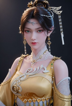 (score_9:1.1),(perfect_anatomy:1.1),upper_body,blurry background,depth of field,(looking_at_viewer:1.1),<lora:YQponyjinpingerV2:0.8>,q1528437228,1girl,solo,long_hair, jewelry, earrings, hair_ornament, dress, black_hair, realistic, chinese_clothes, yellow_dress, green_eyes, brown_hair, hair_bun, necklace, single_hair_bun, bare_legs, feet, hair_rings,fair_skin,(simple background,pure black background,black background:1.3),white_skin,shiny_skin,Ivory_skin,perfect_anatomy BREAK perfect_anatomy,(score_9:1.1),cinematic lighting,volumetric lighting,professional lighting,fair_skin,white_skin,shiny_skin,Ivory_skin,perfect_anatomy,