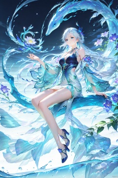 1girl, solo, long hair, breasts, smile, blue eyes, hair ornament, dress, bare shoulders, sitting, full body, flower, white hair, detached sleeves, water, high heels