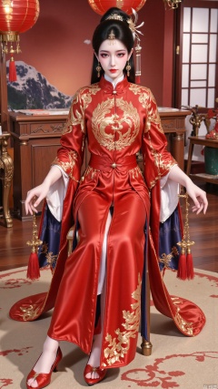YMJHsqc,1girl,solo,sitting in the chair,black hair,updo,hair ornament,hair flower,earrings,red dress,the red dress is adorned with the golden phoenix embroidery,silk texture,long sleeves,wide sleeves,tassel,jewelry,red footwear,indoors,QipaoQ,yunluo,lanterns, Chinese red, Chinese New Year,W拜年M,yunmeng