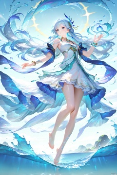 1girl, solo, long hair, hair ornament, dress, jewelry, blue hair, full body, braid, white hair, barefoot, water, white dress, floating