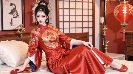 YMJHsqc,1girl,solo,sitting on the bed,black hair,updo,hair ornament,hair flower,earrings,red dress,the red dress is adorned with the golden phoenix embroidery,silk texture,long sleeves,wide sleeves,tassel,jewelry,red footwear,indoors,QipaoQ,yunluo,lanterns, Chinese red, Chinese New Year,W拜年M,yunmeng
