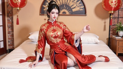 YMJHsqc,1girl,sitting on the bed,black hair,updo,hair ornament,hair flower,earrings,red dress,the red dress is adorned with the golden phoenix embroidery,silk texture,long sleeves,wide sleeves,tassel,jewelry,red footwear,indoors,QipaoQ,yunluo,lanterns, Chinese red, Chinese New Year,W拜年M,yunmeng