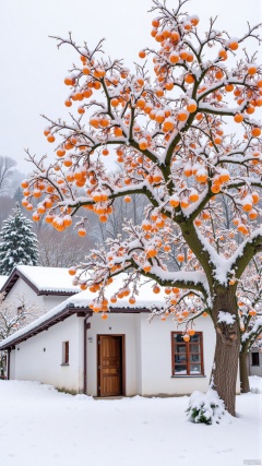 The image shows a small white house with a tree in front of it. The tree is covered in snow and has a bunch of oranges hanging from its branches. The oranges are bright orange and appear to be ripe and ready to be picked. The house has a sloping roof and a wooden door and windows. In the background, there are other houses and trees covered in a blanket of snow. The sky is overcast and the overall mood of the image is peaceful and serene.