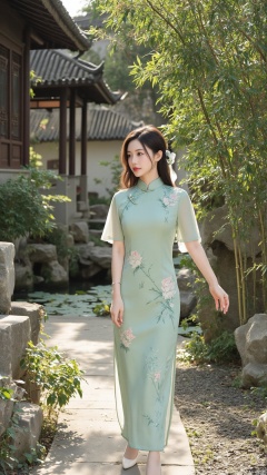 "A serene scene of a classic Jiangnan garden, featuring a graceful woman in a cheongsam strolling along a winding path. Her cheongsam is a soft emerald green, intricately embroidered with lotus flowers and bamboo leaves, symbolizing purity and resilience.