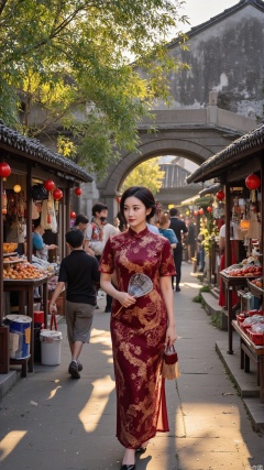 A bustling scene of a traditional market in a Jiangnan ancient town, featuring a radiant woman in a cheongsam strolling through the crowd. Her cheongsam is a bold wine red, intricately embroidered with phoenix patterns, symbolizing nobility and charm.