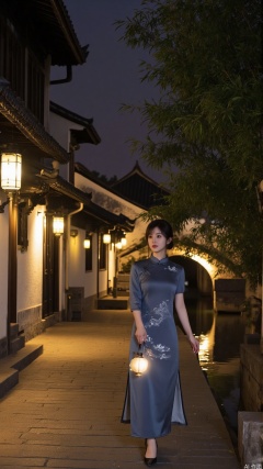 "A tranquil night scene of a Jiangnan ancient town, featuring a charming woman in a cheongsam walking along a cobblestone path. Her cheongsam is a soft navy blue, delicately embroidered with silver stars and waves, symbolizing tranquility and mystery.