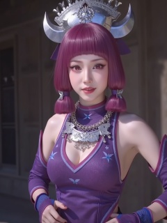 mmgchimeng,Very realistic style,HD photography style,red eyes,purple hair,purple costume,cleavage,breast,