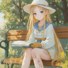 youhua \(wutong\),(colorful:1.3),good work, (best quality), illustration, depth of field, (color),masterpiece,best quality,petite,cute,1girl,(((16 years old)))long hair,bangs,blonde hair ,hair ornament,gloves,long sleeves,verylong hair,blue eyes,barely legs,waist,leg Tattoos,phoebe, smiling, girl blushed, girl likes you, sits, reads, is happy,white wide-brimmed hat,((she study)((writing homework)((sitting on bench)((desk)