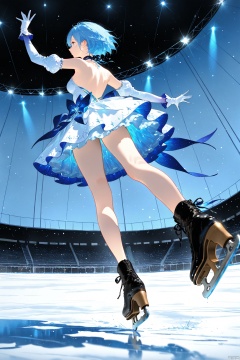 1girl, solo, breasts, short hair, gloves, dress, bare shoulders, medium breasts, blue hair, full body, detached sleeves, white gloves,  black footwear,backless dress, skates, ice skates,Stand on one foot,From front,banderole,Eye contact,on ice rink,Close one's eyes