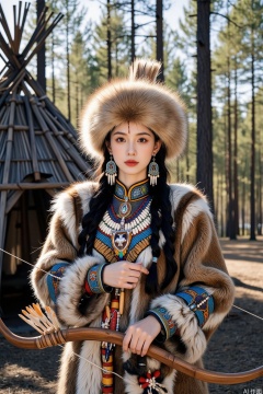 The image depicts a person dressed in traditional Native American attire, standing in front of a teepee structure. The individual is wearing a fur-trimmed garment with intricate beadwork and a large, ornate necklace featuring a central pendant shaped like a bird. They are holding a bow made of wood and adorned with a quiver of arrows. The person also wears elaborate earrings and a fur-lined hat. The background consists of a forest with tall pine trees, suggesting a natural, outdoor setting.