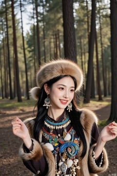 The person has both hands playfully placed behind their back. Their head is tilted to the side, a wide, mischievous smile gracing their lips. Sparkling eyes hint at a hidden jest. The tall pine trees of the forest in the background create a natural, earthy backdrop, enhancing the charm of this light - hearted Oroqen - themed portrait.
