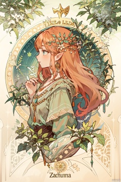 1girl, solo, long hair, blonde hair, hair ornament, jewelry, earrings, pointy ears, necklace, orange hair, profile, leaf, art nouveau, princess zelda,art deco,artist:MuCha