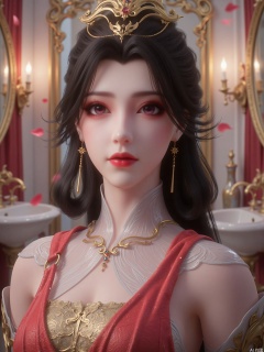 The background is a gorgeously decorated interior scene with mirrors, golden wall lights, sinks and neatly arranged items, and the scattered petals add to the romantic atmosphere. "