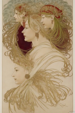 1girl, solo, long hair, blonde hair, hair ornament, jewelry, earrings, pointy ears, necklace, orange hair, profile, leaf, art nouveau, princess zelda,art deco,artist:MuCha