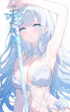 transparent,trough,tender,christmas,lightshadow,1girl, solo, long hair, breasts, bangs, blue eyes, large breasts, simple background, white background, navel, holding, cleavage, bare shoulders, very long hair, blue hair, upper body, weapon, flower, white hair, parted lips, sword, armpits, holding weapon, arm up, holding sword, white flower, white rose