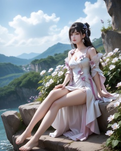 1girl,solo,long hair,breast,medium breast,earrings,hair_ornament,dress,bare_legs,(gaden:1.1),(flower:1.1),sitting,sky,day,thick_thighs,<lora:wy_yuechan_sn_XL5.0:0.8>,brown eyes,barefoot,black hair,, score_9,score_8_up,score_7_up,score_6_up,score_5_up,score_4_up,