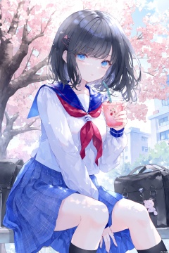 1girl, solo, looking at viewer, bangs, blue eyes, skirt, shirt, black hair, hair ornament, long sleeves, holding, sitting, school uniform, white shirt, pleated skirt, outdoors, parted lips, serafuku, day, socks, hairclip, medium hair, sailor collar, bag, tree, cup, blue skirt, neckerchief, plaid, kneehighs, feet out of frame, blue sailor collar, cherry blossoms, black socks, building, holding cup, red neckerchief, between legs, hand between legs, drinking straw, drink
