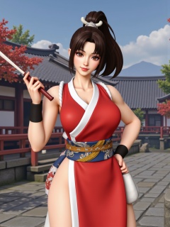 Mai Shiranui,3D animation style,traditional Japanese attire,holding traditional Japanese fan,outdoors,