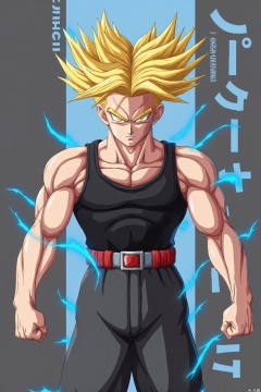 The image depicts a muscular character with spiky blond hair standing confidently. The character is wearing a black sleeveless top and black pants, with a red belt and a gold buckle. The character's arms are flexed, and there are blue energy lines emanating from their body, suggesting they are in a powerful or dynamic state. The background is a gradient of light blue and dark gray, with Japanese text on the right side of the image. The text reads "ワンピール" (unpipel) and "ルズエン" (Luzien). The overall style is reminiscent of anime or manga art.