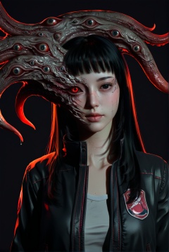 a young woman with long black hair wearing a black jacket with a red emblem on the left side. she has a serious expression on her face. behind her there's a creature with multiple tentacle-like appendages each ending in a glowing red eye. the creature's tentacles seem to be emerging from the back of her head. the background is dark emphasizing the subjects in the foreground.,1girl,horror (theme),black hair,long hair,eldritch abomination,monster,jacket,solo,looking at viewer,extra eyes,black background,realistic,black jacket,simple background,upper body,tentacles,scar,open jacket style_0