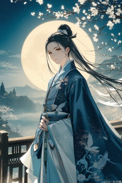 masterpiece,best quality,high detail,close-up,a drawing of a young man,A handsome young Chinese scholar with jade-like skin and long black hair tied by a white jade hairpin,wearing layered ink-blue hanfu embroidered with silver cranes,silk sash adorned with twin jade pendants,standing on a moonlit mountain pavilion surrounded by cherry blossoms and mist,soft lantern glow illuminating his delicate features,traditional watercolor textures blending with cinematic lighting and ethereal atmosphere,