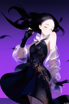 girl,solo,gradient background,gradient,dress,black dress,gloves,black hair,black gloves,purple background,closed eyes,elbow gloves,hair bun,feathers,