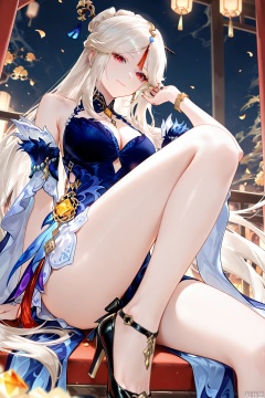 1girl, solo, long hair, breasts, looking at viewer, smile, bangs, large breasts, hair ornament, red eyes, dress, cleavage, bare shoulders, jewelry, sitting, very long hair, closed mouth, white hair, sidelocks, thighs, detached sleeves, hand up, twitter username, nail polish, black footwear, blurry, high heels, bracelet, official alternate costume, parted bangs, fur trim, petals, bare legs, blue dress, gem, tassel, half updo, knee up, vision \(genshin impact\), falling petals, tassel hair ornament, ningguang \(genshin impact\)